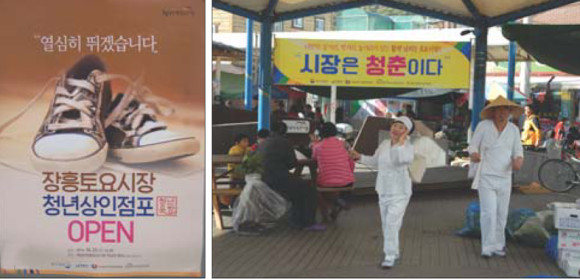 | | | ↑↑ 지난달 청년창업을 알리는 포스터(좌). 다양한 문화공연(우). | | ⓒ 영천시민뉴스 | | 토요시장의 중심에는 휴식과 문화공간이 마련되어 있었다. 취재 당일에도 각설이 등 다양한 공연이 펼쳐지고 있었다.
