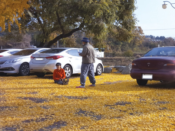 만추의 화북면 사무소 전정에는 붉은색 노란색 단풍들이 한가득 내려오고 앞에는 고현천 상류가 흐르고 있어 늦가을의 풍경을 가장 아름답고 아담하게 표현해 주고 있는 곳으로 유명하다. 지난 11일 오후 부부 방문객들이 동심으로 돌아가 단풍잎을 던지며 아름다운 추억을 사진에 담고 있다.