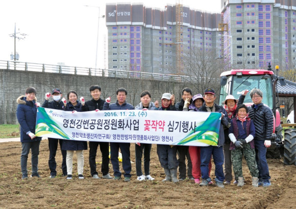 한방산업 이남융 담당은 “금호강 둔치를 내 집 정원처럼 꾸며보라는 시장님의 뜻에 따라 ‘둔치의 정원화’를 위한 작업을 하고 있어요. 수변담당과 협의 후 강변 한편에 꽃이 화려하고 예쁜 관상용으로 적당한 작약밭을 일구려고 합니다.”라고 설명했다. 이종근 수변담당은 “약초밭을 만들자고 계획을 잡고 1년생 약초를 심으려고 하니 예산의 문제가 생겼어요. 그래서 과수한방과와 협의를 했고 도움을 받은 겁니다. 일단 1000㎡부지에 작약을 심어보고 성과가 좋을 경우 더 늘릴 수도 있겠죠. 우리도 약초밭에 꽃이 무성해져 시민들을 위한 새로운 볼거리가 만들어지길 고대하고 있어요”라 전했다. 이날 영천약초생산자연구회의 전주택 회장과 회원들이 참가해 작약심기 대가들의 실력을 가감없이 보여주며 강변공원에 3000포기의 작약 종근을 심었다.