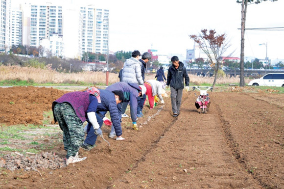 겨울을 재촉하는 매서운 바람에도 불구하고 먼저 덤프트럭 4대 분량의 흙을 차례로 쏟아 부은 뒤 로터리작업을 하고나서 일일이 손으로 굵은 돌을 골라냈다. 그 돌무더기가 가장자리에 한가득 쌓여 밭일구기의 노력을 대변해 주었다. 그들은 영천시 농업기술센터 과수한방과와 본청 힐링산업과 직원들과 약초생산자연구회원들이다.