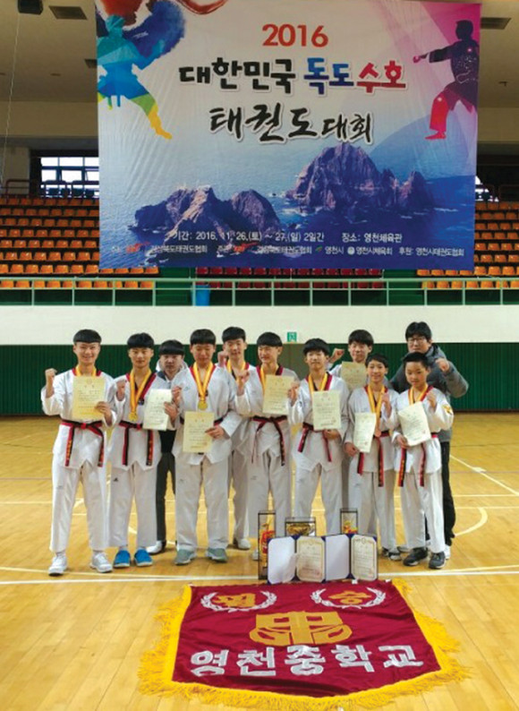 | | | ↑↑ 종합우승을 차지한 영천중 태권도부의 모습. | | ⓒ 영천시민뉴스 | | 경북태권도협회(협회장 윤종욱)는 지난달 26, 27일 양일간 영천체육관에서 2016대한민국 독도수호 태권도대회를 개최했다.