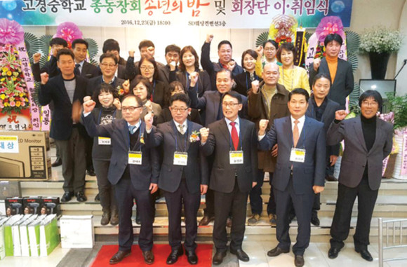 ↑↑ 고경중총동창회 신임 회장단이 동문들에게 인사하며 파이팅을 외치고 있다.