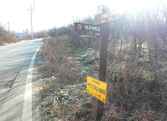 평지 길이 갈라지는 곳에는 경산시에서 안내 푯말을 모두 세웠다. 푯말에는 대구대 거리(3.2km) 와 금박산 거리(4.4km) 그리고 밑에는 국가지점번호(마마 23653605) 표기까지 해두고 있으며 맨 밑에는 긴급구조 119를 나타내고 있다.