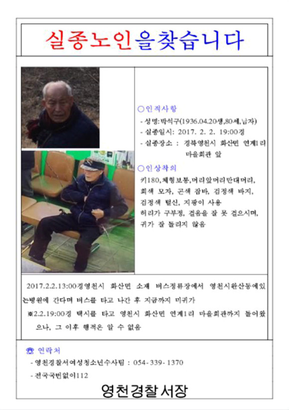 화산면내에서 실종된 박석구 노인을 찾고 있다. 실종 노인은 박석구씨(80)로 지난 2일 오후 7시경 연계1리 마을회관 앞에서 사라지고 연락이 없다는 것이다. 키가 큰 편이며 대머리로 양쪽에는 흰머리가 있다. 박 노인은 지난 2일 병원에 갔다 오다 택시를 타고 귀가 하던 중 이 지점에서 내린 뒤 사라졌다. 연락처는 영천경찰서 339-1370 또는 112이다.