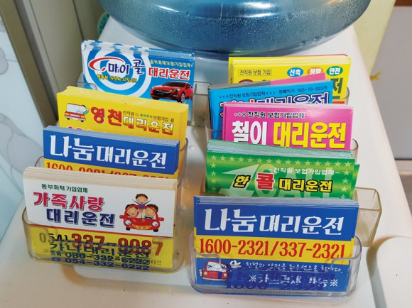 | | | ⓒ 영천시민뉴스 | | 영천대리운전 업체는 얼마나 될까. 시내 한 식당에 가지런히 정열한 영천지역 대리운전 광고 명함이 이색적이다. 정렬된 대리운전 광고 명함 수만해도 9개나 된다.