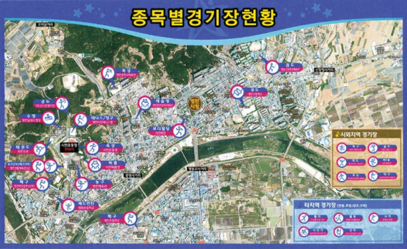 | | | ↑↑ 종목별 경기장 현황. | | ⓒ 영천시민뉴스 | | 손동렬 과장은 “영천에서 3번째 개최되는 이번 도민체전은 영천체육의 인프라를 확실하게 구축하고 지역경제 활성화에 초점을 맞춰 내실있는 대회가 되도록 준비하고 있다.”며 “먼저 체육인프라를 위해 대회준비과정에서 각종 체육시설을 갖춰 도민체전 이후에도 다양한 대회유치와 생활체육에 활용할 수 있도록 준비하고 있다.”고 설명했다.
