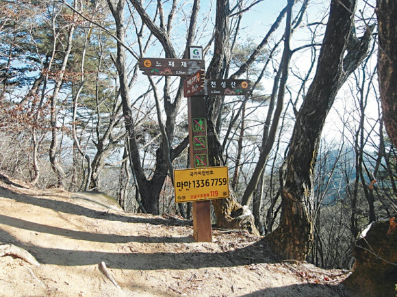 | | | ↑↑ 경산시에서 설치한 안내푯말. | | ⓒ 영천시민뉴스 | | 산으로 들어서니 안내 푯말이 천성산과 느패재 방향 및 국가지점번호를 표기하고 있었다. 경산시에서 설치했다. 탐사 대원들은 능선에서 천성산 방향으로 가야 한다.