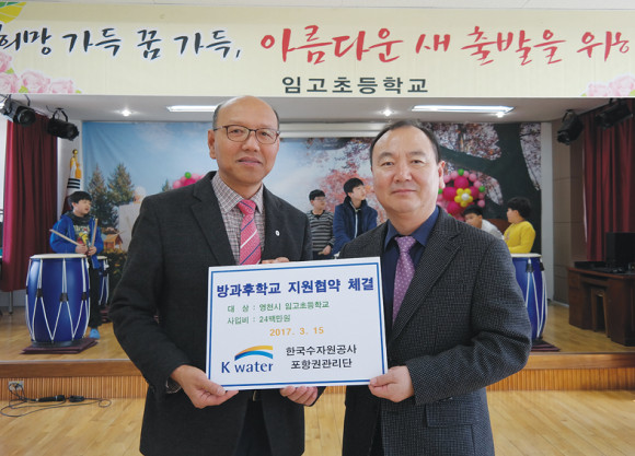 임고초등학교(교장 이강수)와 K-water(한국수자원공사)포항권관리단은 지난 15일 영천댐주변지역 육영지원사업의 일환으로 방과후학교 지원사업 위탁 협약식을 체결했다(사진).