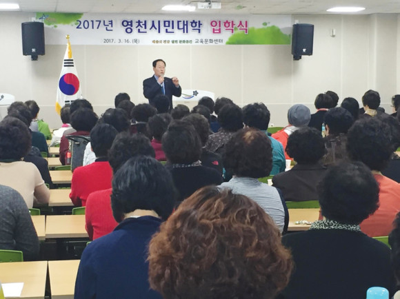 영천시는 평생교육시대에 시민들의 배움에 대한 갈증을 해소하고 삶의 질을 높이기 위해 지난 16일 교육문화센터에서 교육생 100여명이 참석한 가운데 ‘2017년 영천시민대학 입학식’을 개최했다.