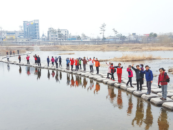 봄내음이 물씬 풍기는 3월이 되면서 금호강 둔치에는 봄을 만끽하는 시민과 운동하는 시민들로 분주한 모습이다. 지난 18일 영천걷기연맹은 문화원 아래 둔치에서 3월 걷기대회를 진행했다. 사진은 행사참가자들이 징검다리에서 즐거워하는 모습이다.
