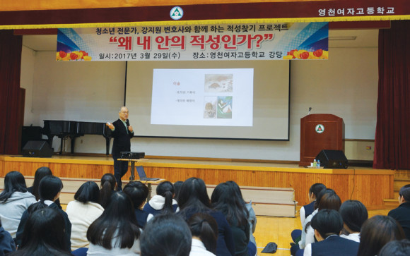 영천여자고등학교(교장 이동걸)는 지난 3월29일 학교 대강당에서 학생들의 적성에 맞는 진로선택을 돕기 위해 청소년 전문가로 활동 중인 강지원 변호사와 함께 하는 적성찾기 프로젝트를 실시했다(사진).