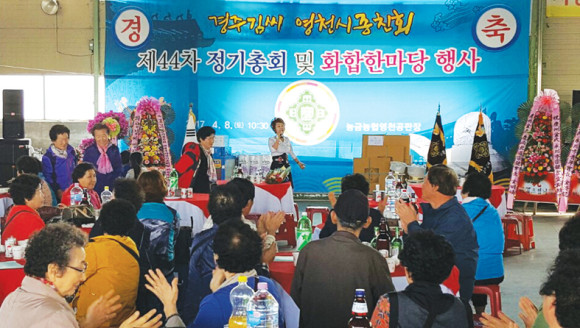 경주김씨 영천시종친회(회장 김낙온) 제44차 정기총회 및 화합한마당 행사가 지난 8일 영천능금농협 공판장에서 김명환 경북도 종친회장, 김장주 경북도 부지사 등 종친들이 대거 참석한 가운데 열렸다.