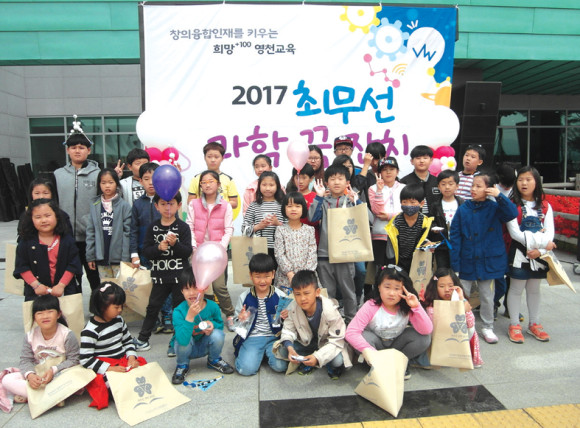 2017년 최무선 과학 꿈잔치가 과학의날인 지난 21일 금호읍 원기리 최무선 과학관에서 500여 명의 초 중 학생들이 참가한 가운데 열렸다. 사진은 화산초등 학생들이 밝은 표정으로 과학꿈잔치 참가 기념사진을 찍고 있다.