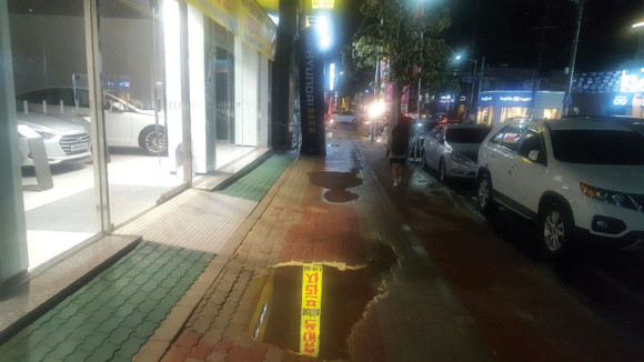 시청 뒤 현대자동차 영천점 앞 인도에 물이 고여 지나가는 시민들이 큰 불편을 겪었다. 주민들은 “인도 변 건물공사를 하면서 차량이 올라가서 인도가 꺼졌다. 시에서 변상을 받아야 한다”고 목청을 높였다.