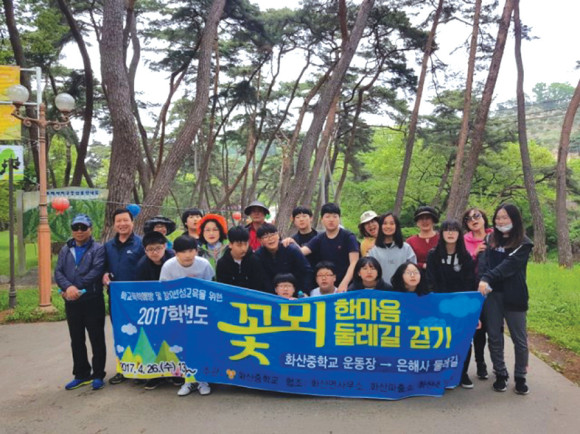 | | | ⓒ 영천시민뉴스 | | 화산중학교(교장 손향희)는 지난4월 26일 청통면 은해사 일대에서 ‘꽃뫼 한마음 둘레길 걷기’를 실시했다. 이날 행사에는 학생과 교사를 비롯해서 졸업생과 학부모가 참여하고 은해사 원주스님을 비롯한 지역민이 동참해서 더욱 뜻깊은 행사가 되었다.