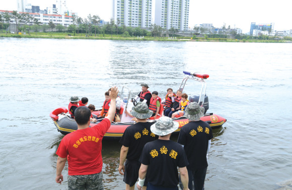 ↑↑ 영천강변공원 금호강에서 어린이들이 보트체험을 하고 있다.