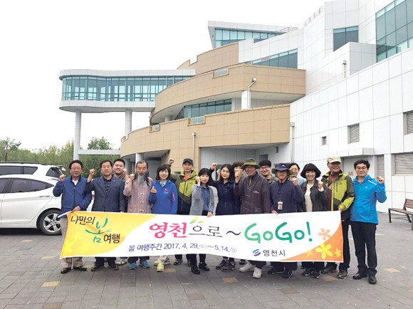 ↑↑ 문화해설사들이 봄 여행지로 영천이 최고라고 설명한 뒤 화이팅을 외치고 있다.