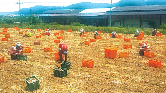 마늘의 최대 주산지인 영천에서 마늘수확이 시작됐다. 올해 마늘은 지난해 잦은 비로 파종이 늦어진데다 봄가뭄이 심해 수확량은 예전보다 저조한 편이다. 사진은 지난 28일 화산면사무소 앞 들판에서 마늘을 수확하는 모습이다.