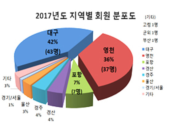 지역별 회원 분포현황(2017년 상반기 기준)을 보면 대구시민이 42%로 가장 많다. 영천시민은 36%로 두 번째로 많았고 포항 시민이 7%로 그 뒤를 이었다.