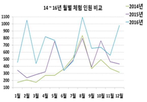이용객 현황을 보면 2014년 8539명(회원 4157명·체험 4382명), 2015년 8706명(회원 3078명·체험 5628명), 2016년 1만1183명(회원 2873명·체험 8310명)으로 매년 증가세를 보이고 있다.