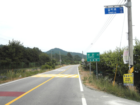 여기서 대원들은 쉬면서 버스를 기다렸다. 봉림역에서 2~300m 떨어진 곳에 갑티로가 시작하는데 이곳이 영천시 신녕면 화서리와 군위군 산성면 봉림리가 경계를 이루고 있는 곳이다. 이날 탐사거리는 4.7km.