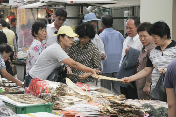 ↑↑ ▲ 영천공설시장에서 제수용 건어물을 고르고 있는 향우회원들.