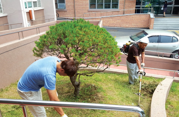 영천시보건소 조경관리는 직원들이 직접하고 있다. 무더위가 한창 기승을 부리던 지난 6일(낮최고기온 34.1도) 보건위생과 류치득 직원 및 담당자들이 예초기를 들고 보건소 청사내 곳곳을 다니며 예초작업을 펼쳤다.