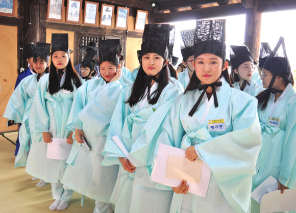 | | | ↑↑ 전통 과거시험 재현 행사에 참여한 여학생들의 모습이 사뭇 진지하다. | | ⓒ 영천시민뉴스 | | 영천향교(전교 김달헌)에서는 지난 15, 16일 이틀간 영천관내 5개 고교생 50명을 대상으로 ‘진사, 생원 납시오~’ 전통과거시험을 재현하는 행사를 개최했다.