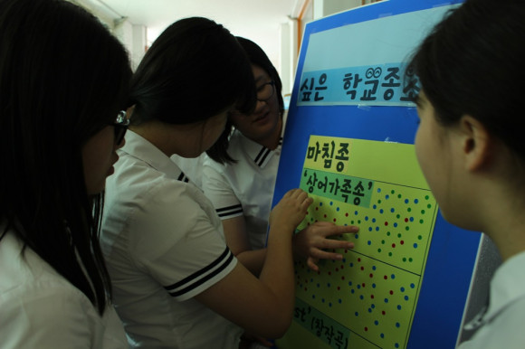 1차 예선을 통과한 6곡의 시작종과 마침종을 학생들이 UCC로 제작하여 제출한 작품을 방송반에서 자율학습시간과 점심시간에 들려주었고 학생들은 자신이 선호하는 시작종과 마침종소리에 스티커를 붙였다. ‘우리들이 듣고 싶은 학교종소리’에 최종 선정된 시작종은 프로듀서 101의 ‘나야나’를 패러디한 1-2반 학급이 최우수상을 수상했고 마침종은 ‘상어가족송’을 패러디한 3-4반이 최우수상을 차지했다.