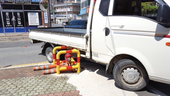 소화전 보호대 위 화물차 적재함 끼여