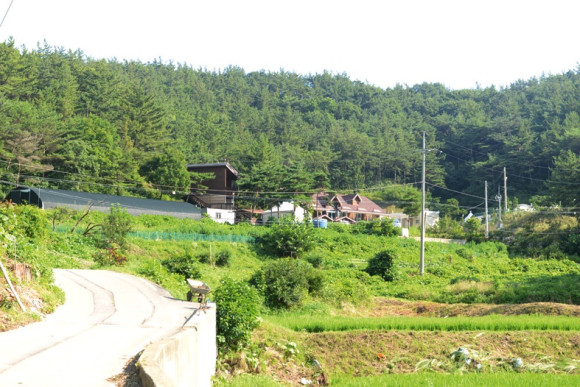 매화둠벙마을로 가는 길은 1980년대처럼 시골스러운 분위기가 많았다. 먼저 가장 눈에 들어오는 것은 낮은 야산에 울창한 숲이 도로 옆을 수놓았고 바다를 메운 간척지의 친환경 논은 바둑판처럼 경지정리한 영천의 논과는 달리 타원모양의 논둑이 정겹게 보였다.