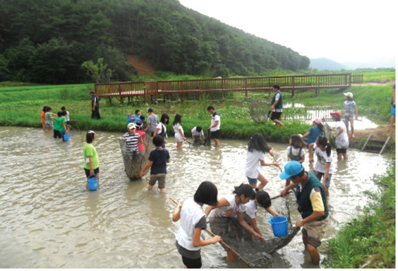 마을입구에서 만난 어르신은 “둠벙은 논 가장자리에 물을 저장하기 위해 파놓은 작은 물웅덩이를 말한다. 수로가 잘 발달하지 못했던 옛날에는 논에 물을 대기 위해 논 주변에 물을 모아놓는 둠벙을 만들었다.”고 설명한 뒤 “마을에는 학생들과 단체에서 많이 오고 있다. 군청에서도 가끔 방문하여 마을을 어떻게 운영할 것인지 대화를 하기도 한다.”고 설명했다.