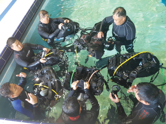 이날 교육은 시야가 흐린 수중에서 일어나는 사고를 대비해 스킨스쿠버스킬 뿐만 아니라 구조교육, 심폐소생술, 원형수색 등 다양한 교육을 진행했다.