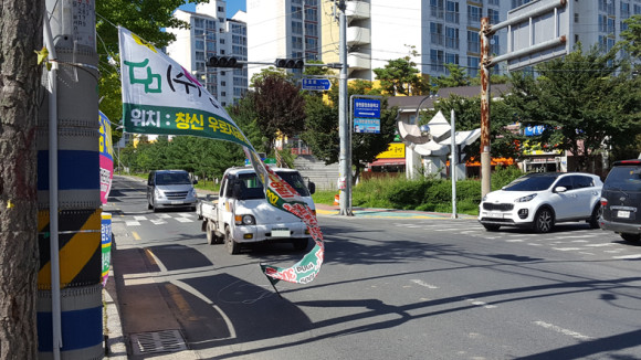 지난 26일 오후 북문통 사거리 도로변에 걸린 현수막이 한쪽 줄이 떨어져 바람에 많이 나붙기며 지나는 차량들에 위협을 가하고 있었다. 지정 장소가 아닌 도로변 현수막은 어떻게 돌변할지 모르는데 흉기 보다 더 위험한 일이 일어날 수 있으므로 철저한 단속이 필요하다.