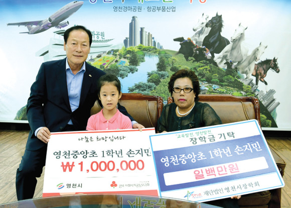 영천중앙초등학교 1학년 손지민 학생은 지난 8월30일 영천시장학회(이사장 김영석)에 장학금 100만원과 불우이웃돕기 성금 100만원을 기부했다.
