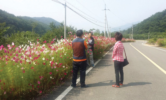 영천시 자양면 삼귀리 도로변에 코스모스가 활짝 펴 장관을 연출하고 있다. 이곳을 지나는 시민들이 코스모스 길 장관에 감탄하며 꽃을 배경으로 사진을 찍고 있다.