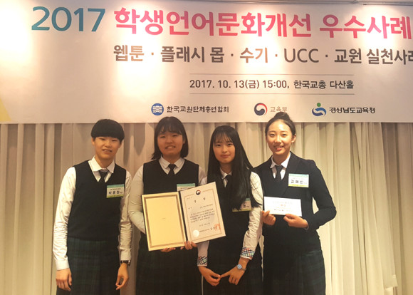 영천여자고등학교(교장 이동걸)는 지난 13일 ‘2017년 학생언어문화개선 우수사례’ 시상식에서 교육부장관상을 수상했다.