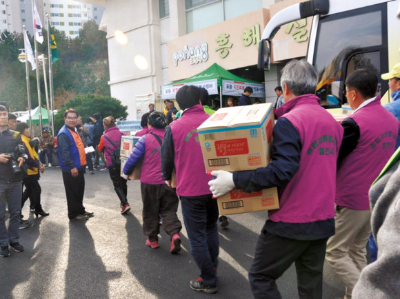 포항 지진에 영천지역에 자원봉사자들의 활동이 본격적으로 진행되고 있다. 지난 17일 영천시 자원봉사센터에서 대피소가 마련된 포항시 흥해읍 체육관에 구호물품을 전달하며 격려의 손길을 보내고 있다.