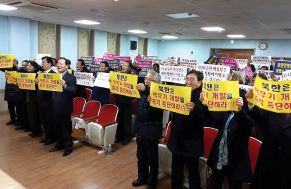 | | | ⓒ 영천시민뉴스 | | 영천시 고엽제전우회(회장 황태수) 지난 2일 오전 보훈회관 대강당에서 이만희 국회의원, 김영석 시장, 한혜련 도의원 등이 참석한 가운데 ‘북한은 핵무기 개발을 즉각 중단하라“ 등의 구호를 외치며 안보결의대회를 가진 뒤 회원들 위안을 겸한 송년행사도 가졌다.