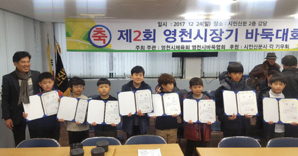 | | | ↑↑ 학생부 입상자들이 상장을 들고 기념촬영을 하고 있다. | | ⓒ 영천시민뉴스 | | 일반부(단체전)=우승 : 윤영하 외 4명, 준우승 : 유석권 외 4명, 3위 : 조영돈 외 4명. 학생부=1위 : 표민기(영천중앙초), 2위 : 고민성(영천중앙초), 3위 : 이시훈(영천중앙초)·이찬문(영천중앙초), 장려상 : 이희룡(영천중앙초)·배준희(영천중앙초)·손민성(경산평산초)·조성우(대구매동초).