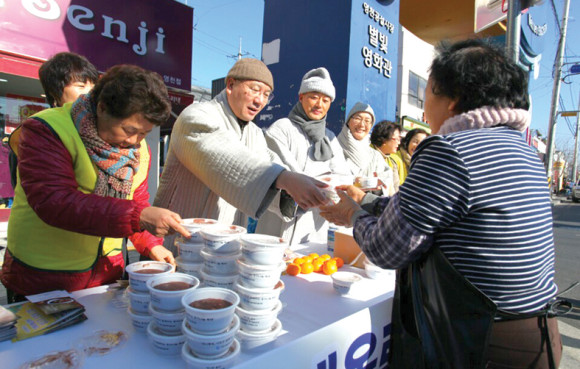 지난 21일 영천재래시장 일대에서 동지팥죽 나눔행사가 열려 오가는 시민들의 눈길과 발길을 붙잡았다. 영천 은해사(주지 돈관스님)에서 ‘2018년 평창동계올림픽 성공기원’을 위한 팥죽나누기 행사를 열어 은해사 스님들과 신도회원들이 나서서 약 1500그릇의 팥죽을 시민들에게 전달했다.