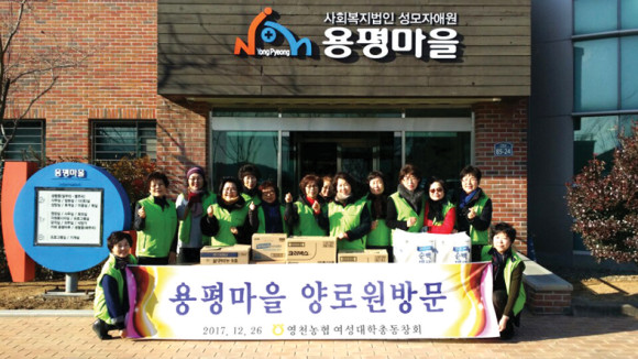 | | | ⓒ 영천시민뉴스 | | 지난 12월26일 영천농협여성대학 총동창회(회장 김재선)에서 용평마을 양로원을 방문했다. 이날 농협여성대학 총동창회장을 비롯해 각 기수별 회장들이 양로원 어르신들이 사용할 생필품을 전달하고 봉사활동을 펼쳤다. 김재선 회장은 “다음에도 꼭 다시 와달라는 어르신들의 말씀이 귓전을 맴돈다. 지속적인 활동이 이뤄지도록 노력하겠다.”고 전했다.