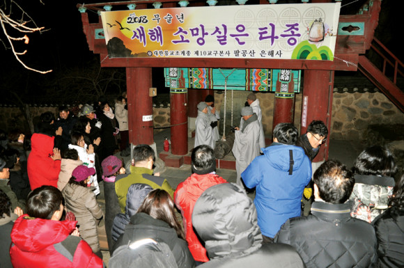 | | | ⓒ 영천시민뉴스 | | 대한불교조계종 제10교구 본사 은해사는 지난 12월31일 스님과 신도들 100여명이 모여 새해를 맞이하는 타종행사를 가졌다. 이날 행사는 정각 자정이 되면 돈관 큰스님의 타종이 시작되고 이후 참석자들이 모두 세번씩 종을 치며 소원을 빌었다. 또 미리 준비해둔 모닥불에 가래떡과 고구마, 밤을 구워먹으며 덕담을 나누며 함께 새날의 희망을 꿈꾸는 시간이 됐다.