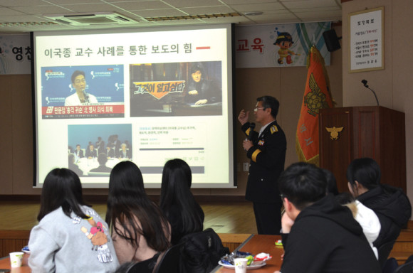 | | | ↑↑ 이상무 서장이 특강하는 모습. | | ⓒ 영천시민뉴스 | | 이상무 서장은 “올해 초 우연한 기회에 학생기자단 수업하는 자리를 방문했다. 그 자리에서 다시 한번 학생기자들을 소방서에 초청하여 대화의 시간을 가지기로 약속했었다. 오늘 이 자리는 그날의 약속을 이행하기 위해 마련했다.”며 “고 3학생들은 대입이라는 힘든 산을 잘 넘어왔으리라 믿는다. 지금 1, 2학년들은 이번 기회를 잘 활용하여 수시전형에서 조금이나마 유리한 입장이 되기를 바란다.”고 특강에 대한 배경을 설명했다.