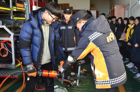 | | | ↑↑ 구조장비를 체험하는 모습. | | ⓒ 영천시민뉴스 | | 이번 견학은 지역의 5개 고등학교 학생기자단 20여명이 참석하여 소방서에서 하는 일 소개, 화재 시 119신고요령, 연기소화기를 이용한 소화기 체험, 심폐소생술, 구조장비 실습 등을 진행했다.