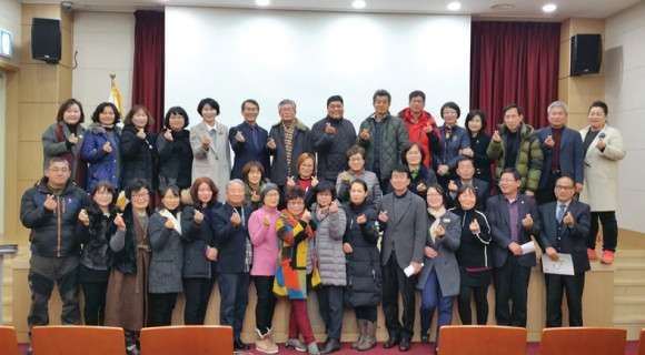↑↑ 마을평생교육지도자들이 총회를 마친 후 화이팅을 외치고 있다.