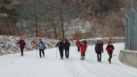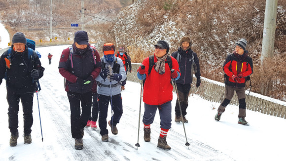 영천시경계탐사대(대장 김성근)가 아주 보기 드문 설산 탐사활동을 폈다. 지난 13일 오전 화남면 용계리 용계댐위 정림사에서 출발, 방가산(750m) 능선을 타고 화남면 구전리로 내려오는 코스를 탐사했는데, 화남면에는 전날 내린 눈으로 도로와 산 능선엔 눈이 쌓여 영천에선 보기드문 설산(상고대 포함) 탐사를 했다. 산능선 높이는 600m~650m.