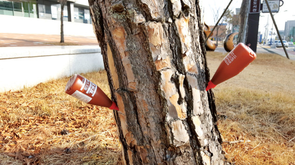 도서관 앞에 있는 소나무들이 영양제의 일종인 수간주사를 맞고 있다. 수간주사는 나무의 각종 병 예방이나 솔잎혹파리 방제를 위해 사용되고 있는데, 예전에 비해 나무들이 다양한 방법(가로수 물주머니 등)으로 고가의 대우를 받고 있다.