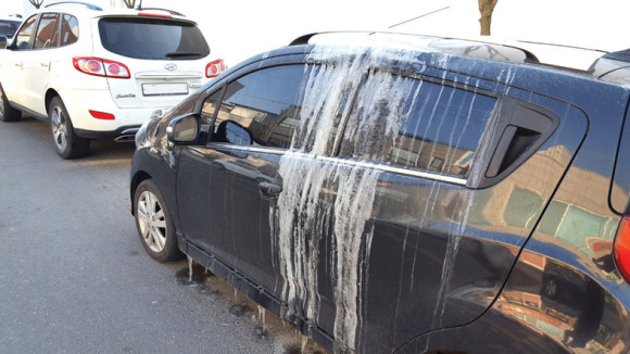 ↑↑ 차량위로 흘러내린 물이 얼음으로 변해 강추위를 실감케 하고 있다.