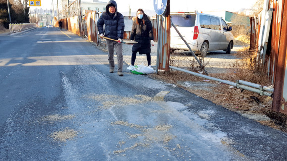 ↑↑ 강추위로 도로 일부가 빙판으로 변하자 시민이 모래를 뿌리고 있다.